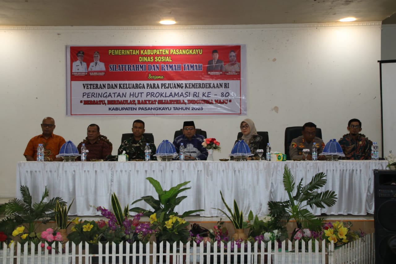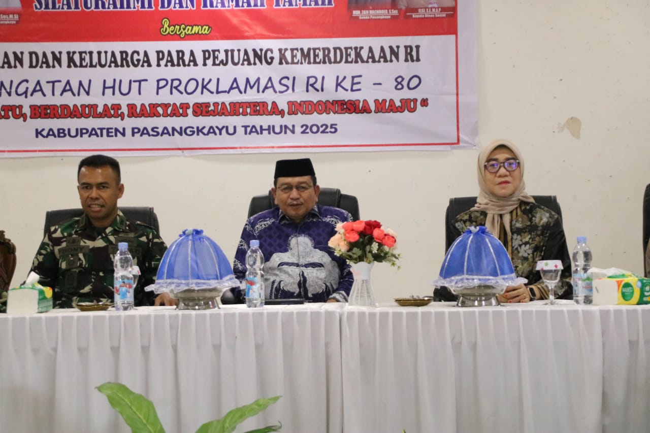 PASANGKAYU, – Menjelang peringatan Hari Ulang Tahun (HUT) proklamasi kemerdekaan Republik Indonesia ke-80, Pemerintah kabupaten pasangkayu menggelar kegiatan “Silaturahmi dan Ramah Tamah Bersama Veteran dan Keluarga Para Pejuang Kemerdekaan Republik Indonesia”. Tepatnya di Aula Hotel Trisakti Pasangkayu. Sabtu (16/8/2025).Acara ini mengusung tema “Bersatu Berdaulat, Rakyat Sejahtera, Indonesia Maju”.Kegiatan ini diselenggarakan oleh Dinas Sosial kabupaten Pasangkayu di Aula Hotel Trisakti Pasangkayu.Turut hadir dalam kegiatan tersebut, Bupati dan Wakil Bupati Pasangkayu, anggota forkopimda kabupaten Pasangkayu, segenap pimpinan instansi vertikal dan para pejabat lingkup pemerintah kabupaten pasangkayu, para sesepuh, pejuang veteran serta Warakawuri.Dalam sambutannya, Bupati Pasangkayu, H. Yaumil Ambo Djiwa, menyampaikan hari ini kita bukan hanya memperingati sebuah angka atau usia kemerdekaan, tetapi kita juga merenungkan kembali makna perjuangan yang telah dirintis, diperjuangkan, bahkan ditebus dengan darah dan air mata oleh para pendahulu kita.“Bapak-bapak dan ibu-ibu sekalian adalah saksi hidup, keluarga pelaku sejarah, sekaligus penjaga api semangat Kemerdekaan. Tanpa pengorbanan Dan keberanian para pejuang, mungkin kita tidak akan menikmati kebebasan dan kemajuan seperti sekarang” Ungkap Pak Yaumil