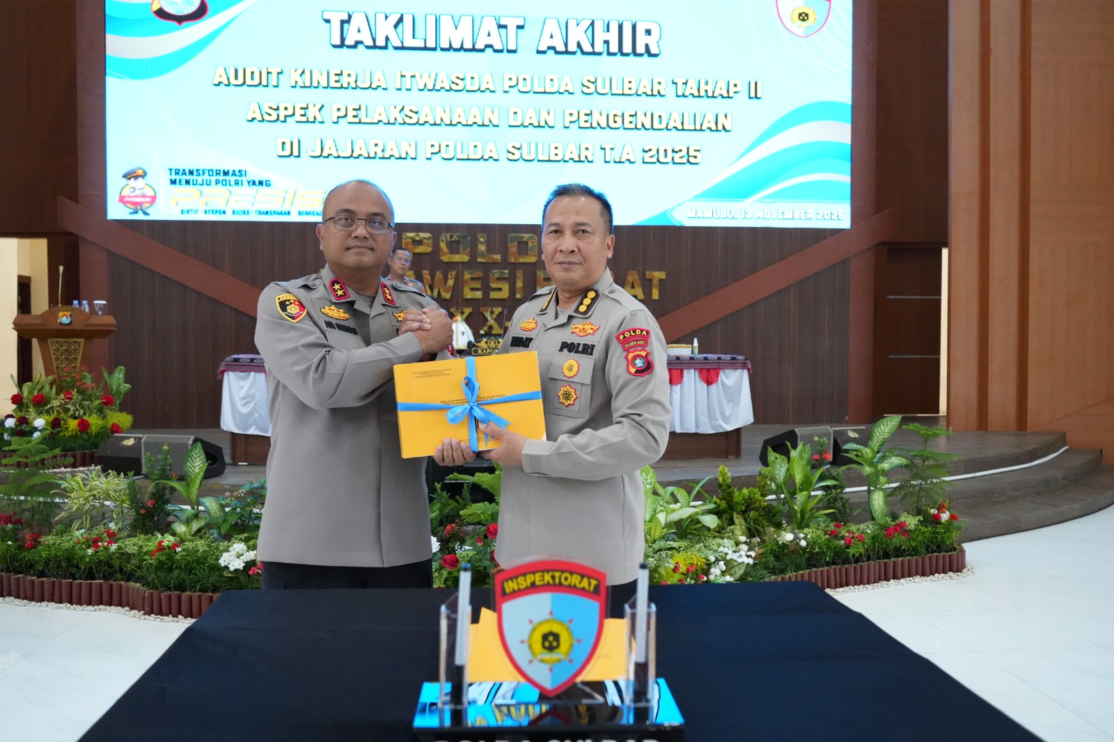 Polda Sulbar – Kapolda Sulawesi Barat, Irjen Pol. Adi Deriyan Jayamarta, secara resmi menutup kegiatan audit kinerja tahap II Itwasda Polda Sulbar T.A. 2025, yang meliputi aspek pelaksanaan dan pengendalian pada seluruh satuan kerja (satker) dan satuan wilayah (satwil) jajaran Polda Sulbar, Kamis (13/11/25) di Aula Marannu Mapolda.