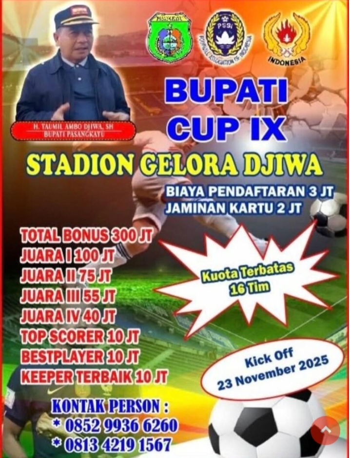 Harian Indonesia Pos.com | Pasangkayu, – Turnamen sepak bola paling bergengsi di Kabupaten Pasangkayu, Bupati Cup IX, secara resmi akan digelar pada 23 November 2025 di Stadion Glora Djiwa Pasangkayu. Ajang tahunan ini menjanjikan total hadiah dan bonus senilai Rp300 juta, dengan tujuan utama menjaring dan mengembangkan bibit-bibit pesepak bola muda serta memperkuat semangat sportivitas dan persaudaraan di tengah masyarakat.