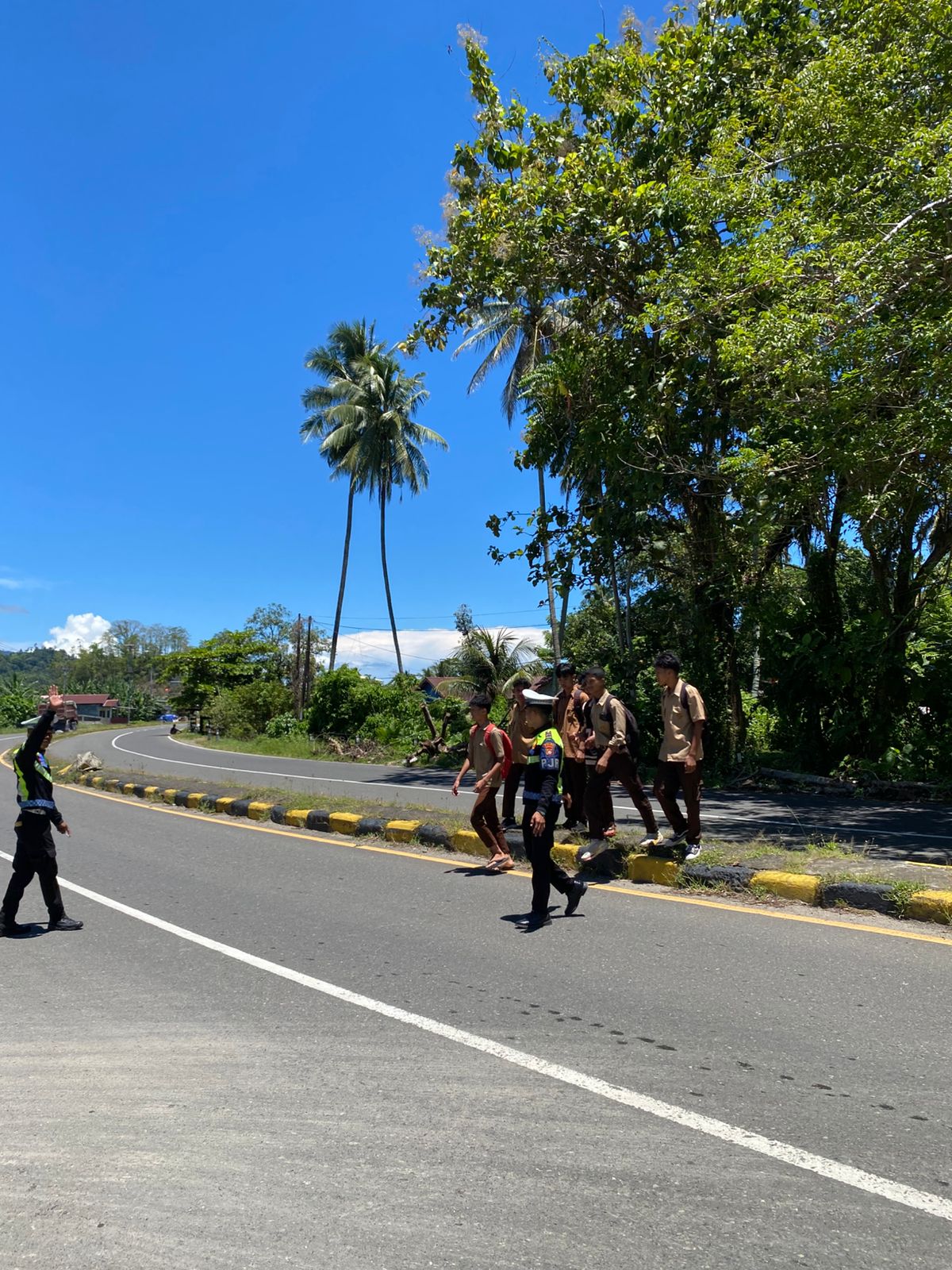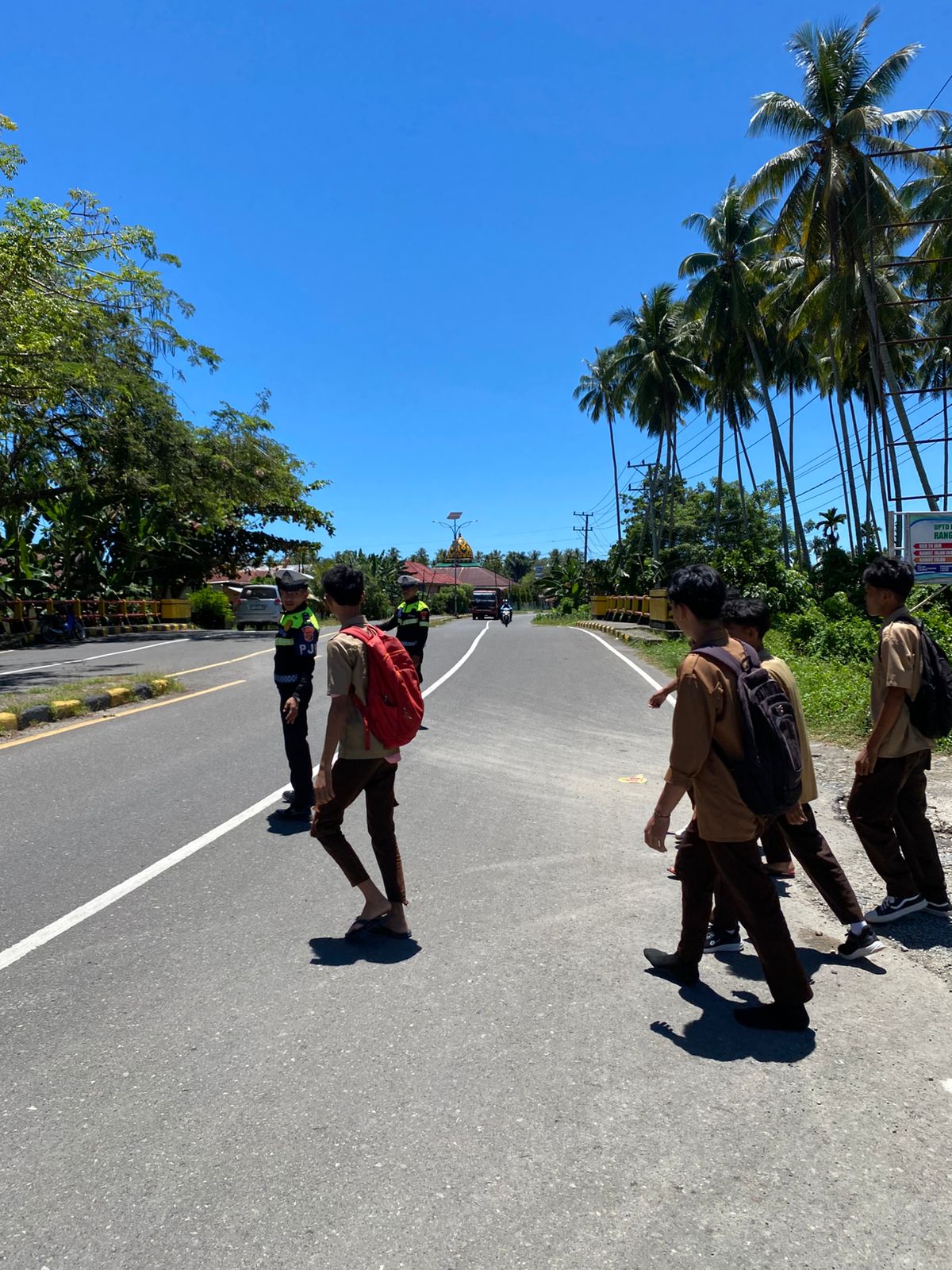 Kegiatan ini tidak hanya berfokus pada pengaturan arus lalu lintas, tetapi juga menjadi momen edukasi langsung bagi siswa pengguna kendaraan bermotor.