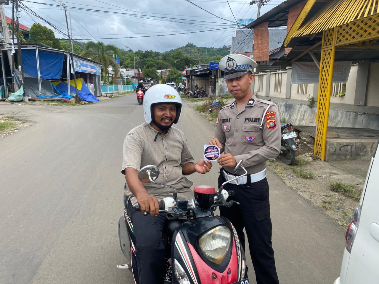 2. Pembagian Stiker Edukasi: Sebagai bentuk kampanye visual yang berkelanjutan, tim membagikan stiker Dikmas Lantas yang berisi pesan-pesan kunci tentang keselamatan berlalu lintas. Stiker ini diharapkan dapat menjadi pengingat visual bagi setiap pengendara untuk selalu mengutamakan keamanan saat berkendara.