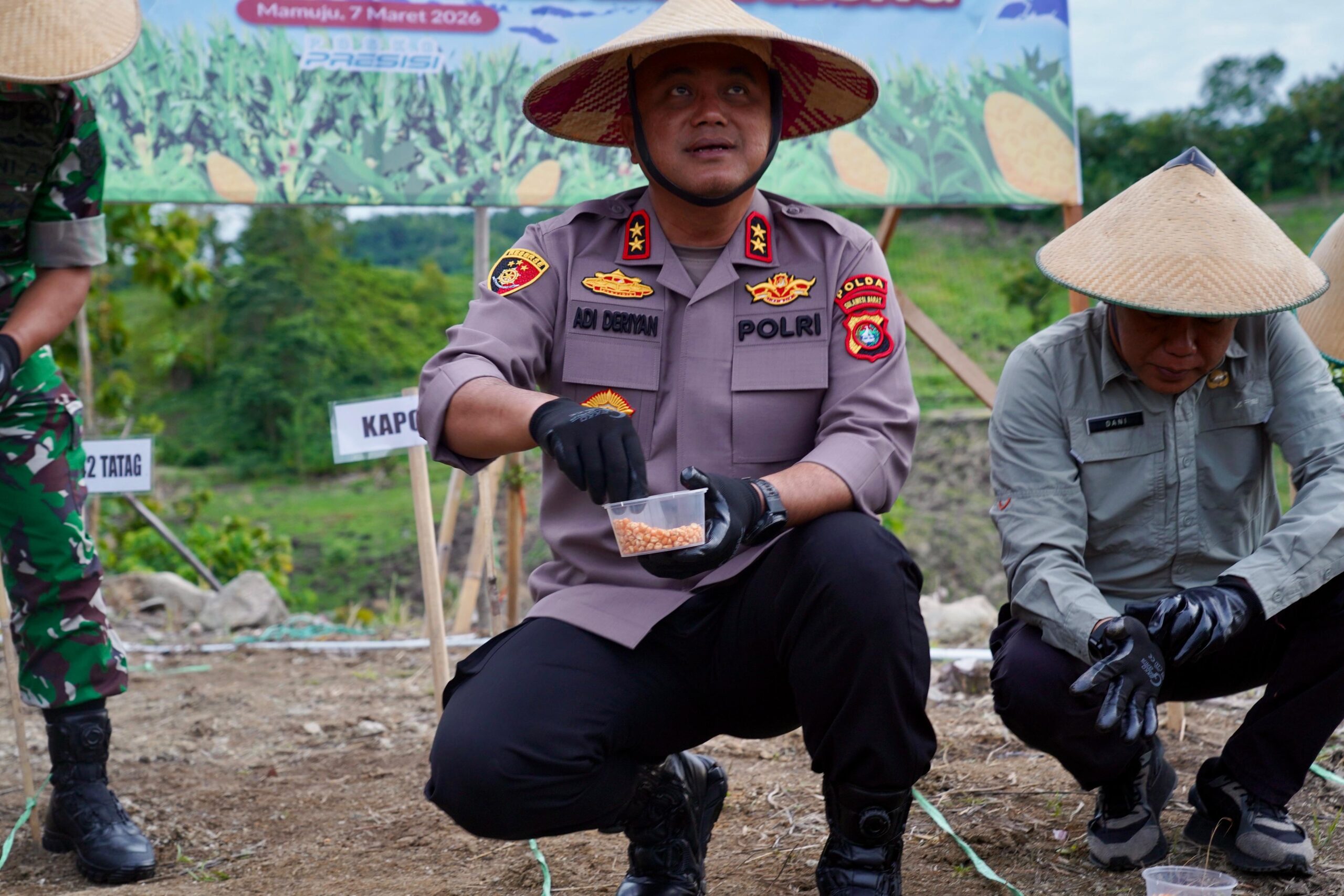 Polda Sulbar – Setelah mengikuti kegiatan tanam raya jagung serentak kuartal I Tahun 2026 secara daring yang dipimpin langsung Kapolri, Kapolda Sulbar Irjen Pol Adi Deriyan Jayamarta bersama jajaran serta beberapa pejabat terkait melakukan aksi nyata penanaman jagung di halaman Joglo Balanipa Polda Sulbar, Sabtu (7/3/2026)