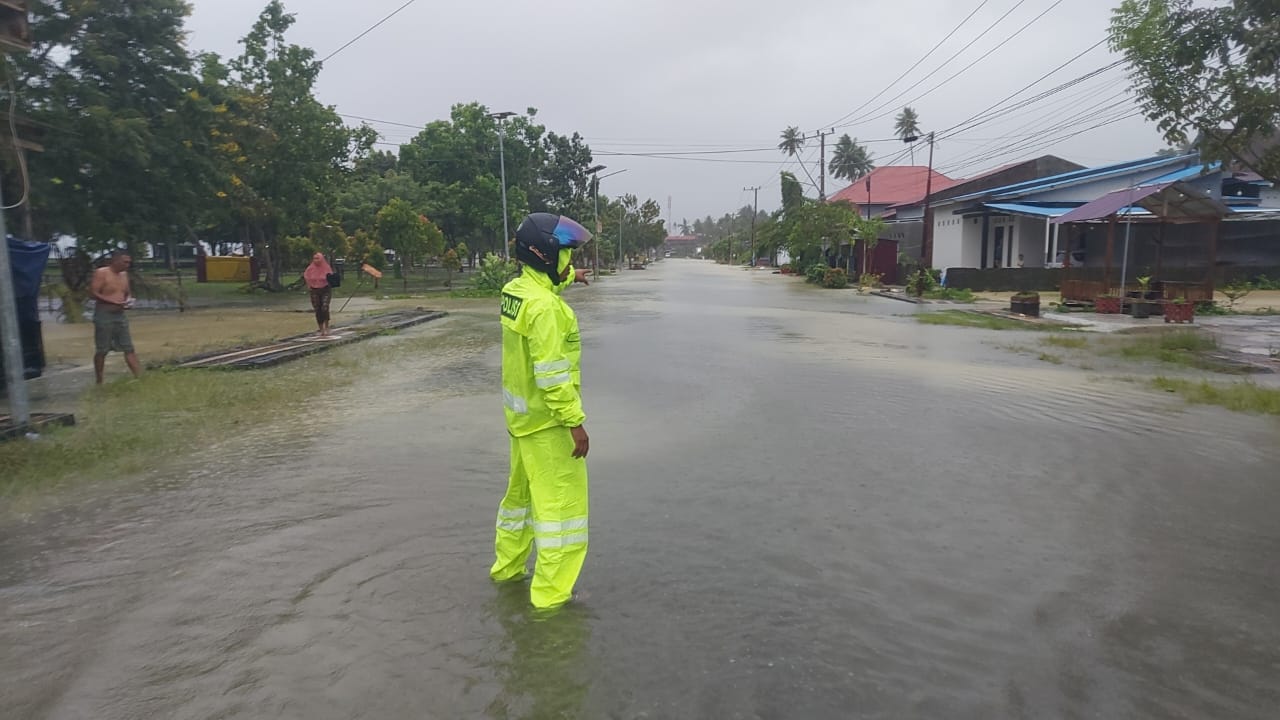 Polres Pasangkayu — Personel Polsek Pasangkayu melakukan pemantauan terhadap luapan air akibat banjir yang menggenangi sepanjang Jalan Anjungan Pasangkayu, Jalan Muhammad Hatta, Kabupaten Pasangkayu, Minggu (11/12/2026).