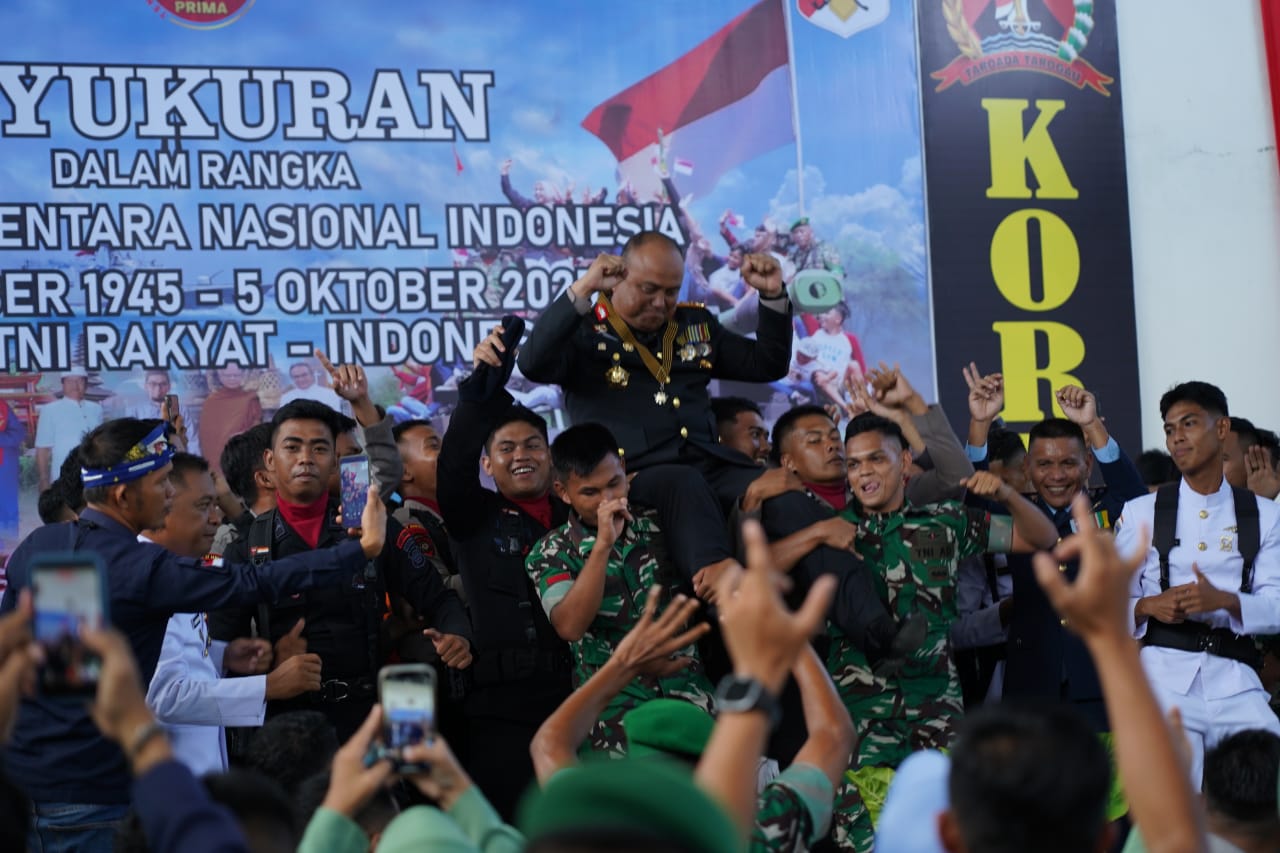 Polda Sulbar – Kapolda Sulawesi Barat, Irjen Pol Adi Deriyan Jayamarta, bersama Ketua Bhayangkari dan jajaran pejabat utama Polda Sulbar, turut serta memeriahkan peringatan Hari Ulang Tahun (HUT) ke-80 Tentara Nasional Indonesia (TNI), Minggu (5/10/25) di Lapangan Tammajarra, Korem 142/Tatag.