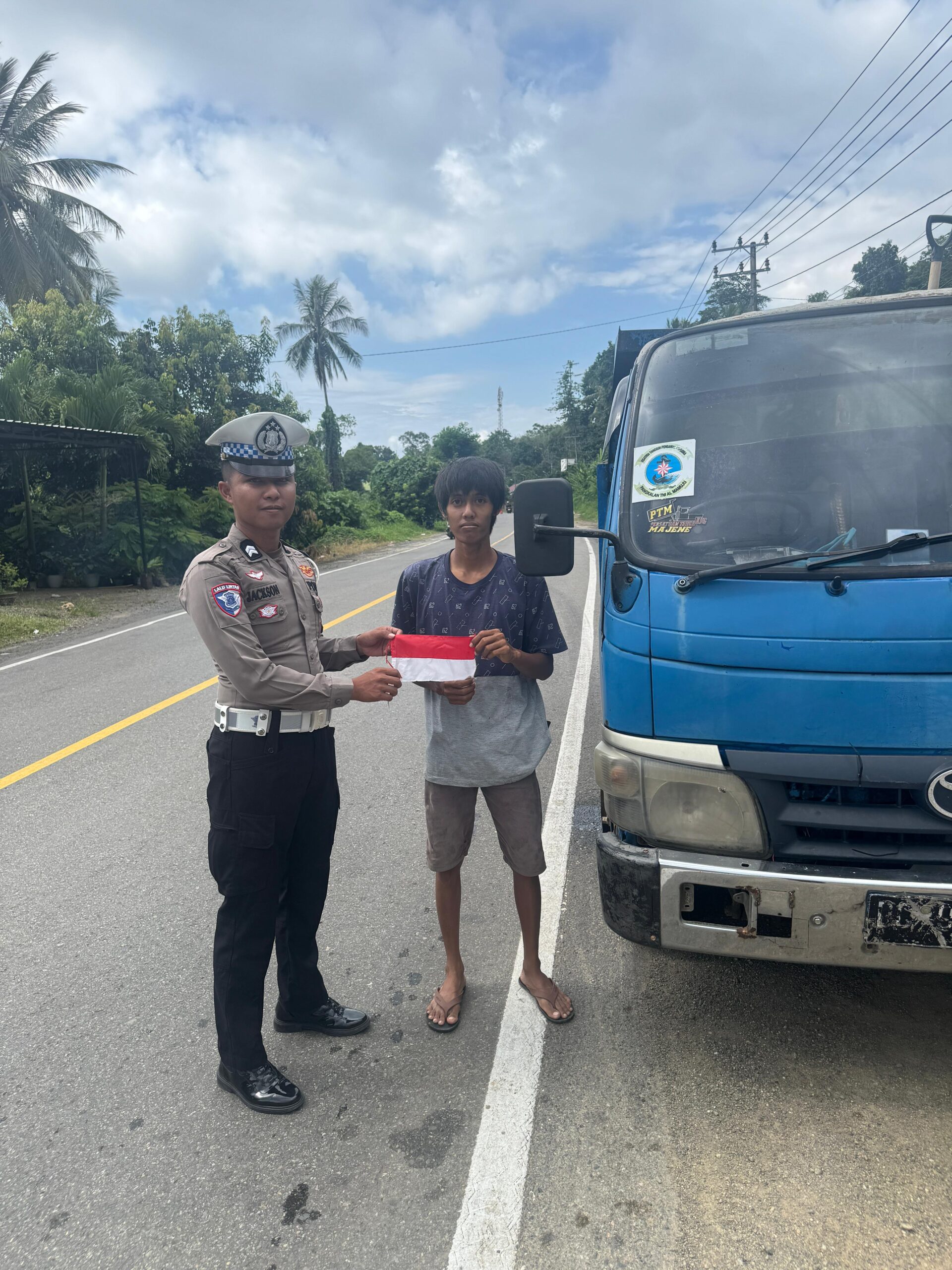 Di Pos PJR Ditlantas Lengke, Rabu (6/8/25) setiap pengendara yang melintas diberhentikan dan petugas memberikan bendera merah putih kepada pengendara tersebut. Petugas PJR dengan humanis memberikan bendera dan mengajak pengendara memasang bendera merah putih di kendaraan sebagai simbol patriotisme di kendaraannya.