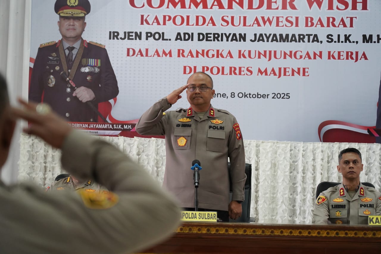 Polda Sulbar – Kapolda Sulawesi Barat, Irjen Pol Adi Deriyan Jayamarta, dalam rangkaian kunjungan kerjanya ke Polres Majene, Rabu (8/10/25) di Aula Mapolres. Dalam kunjungan tersebut, Kapolda memberikan arahan penting kepada seluruh personel Polres Majene.