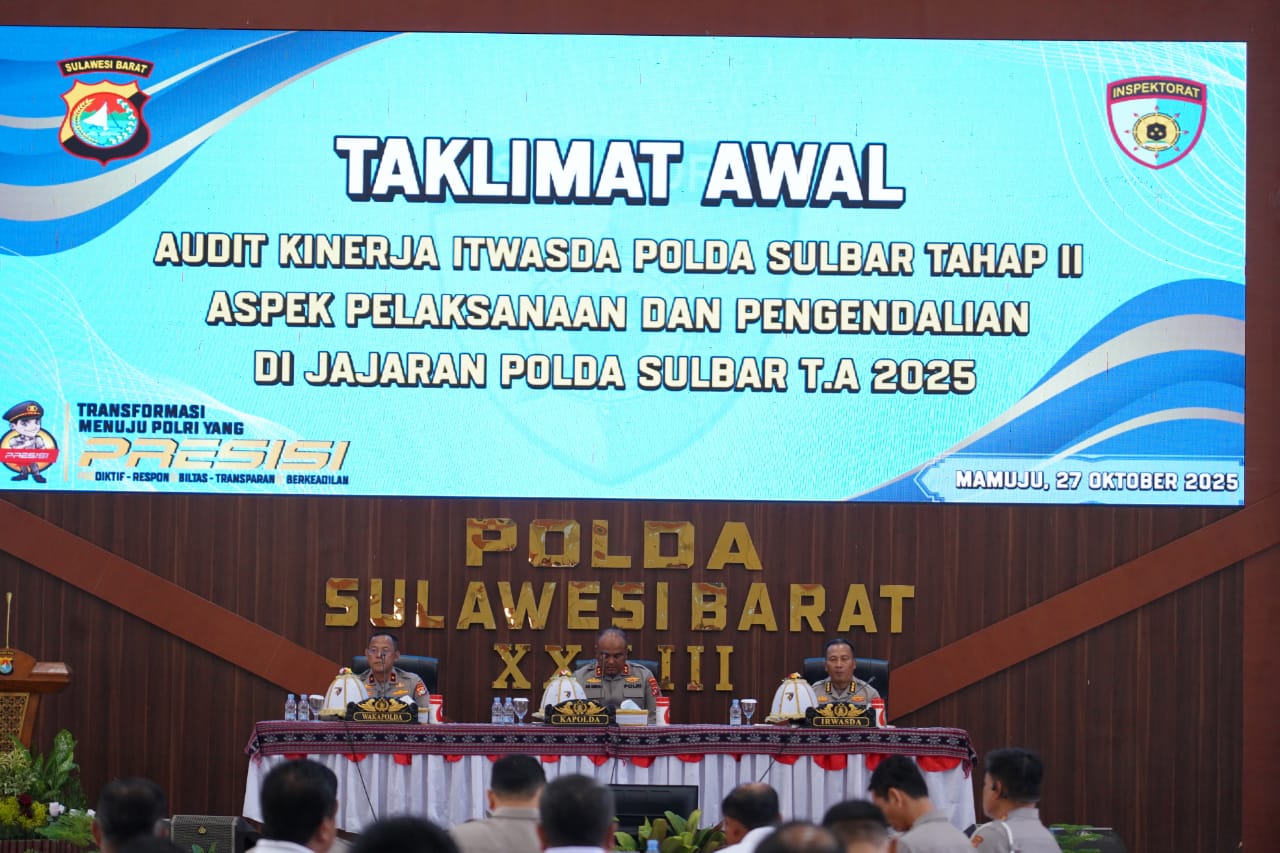 Polda Sulbar – Kapolda Sulawesi Barat, Irjen Pol Adi Deriyan Jayamarta, membuka kegiatan Audit Kinerja Itwasda Polda Sulbar Tahap II Aspek Pelaksanaan dan Pengendalian T.A. 2025 di jajaran Polda Sulawesi Barat. Kegiatan ini menandai langkah penting dalam penguatan fungsi pengawasan di lingkungan Polda Sulbar, Senin (27/10/25) di Aula Mapolda.