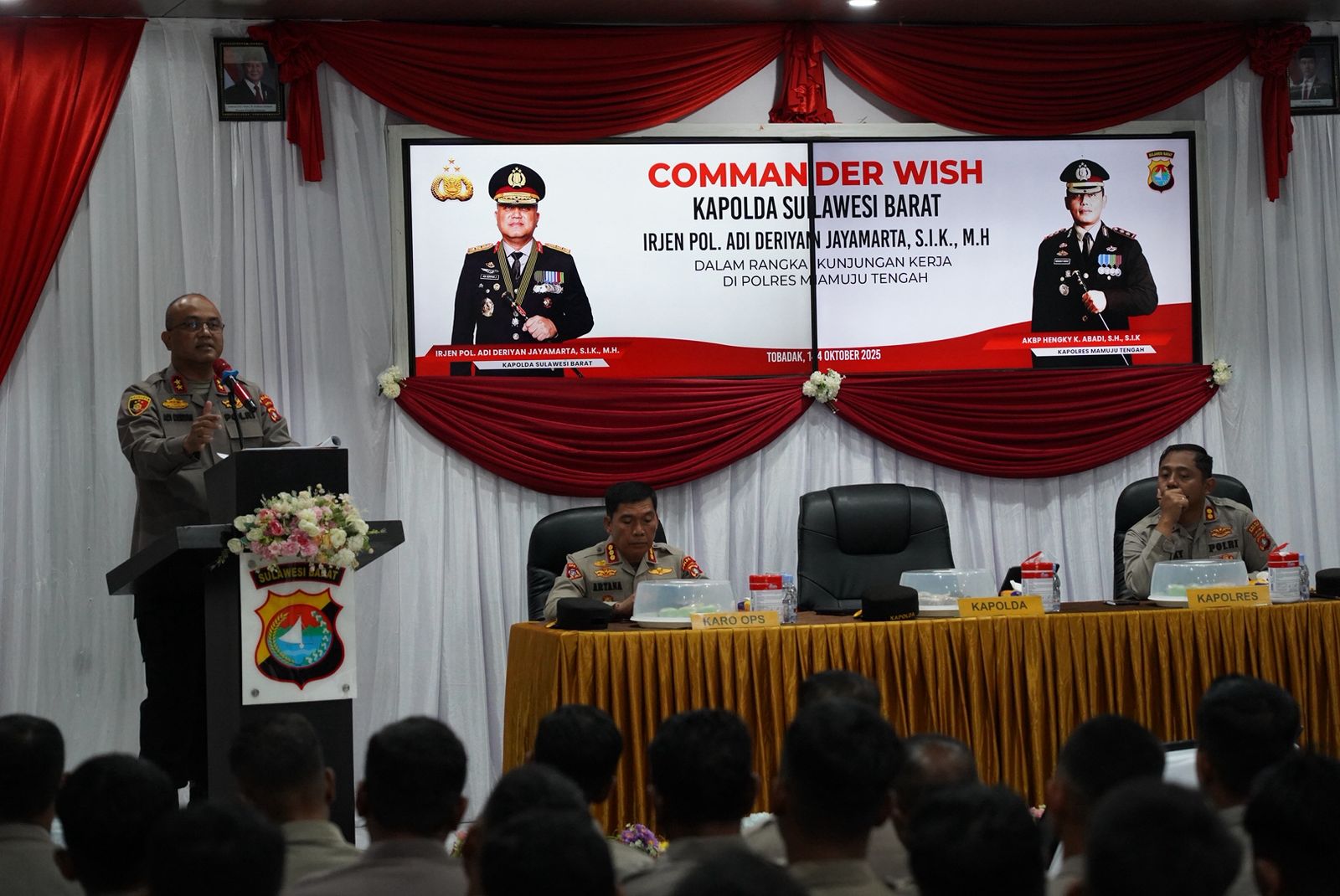 Polda Sulbar – Kapolda Sulbar, Irjen Pol Adi Deriyan Jayamarta, memberikan arahan inspiratif kepada jajaran Polres Mamuju Tengah (Mateng) dalam kunjungan kerjanya. Arahan tersebut berfokus pada internalisasi nilai-nilai luhur kepolisian sebagai “Abdi Utama Bagi Nusa dan Bangsa”, Selasa (14/10/25).