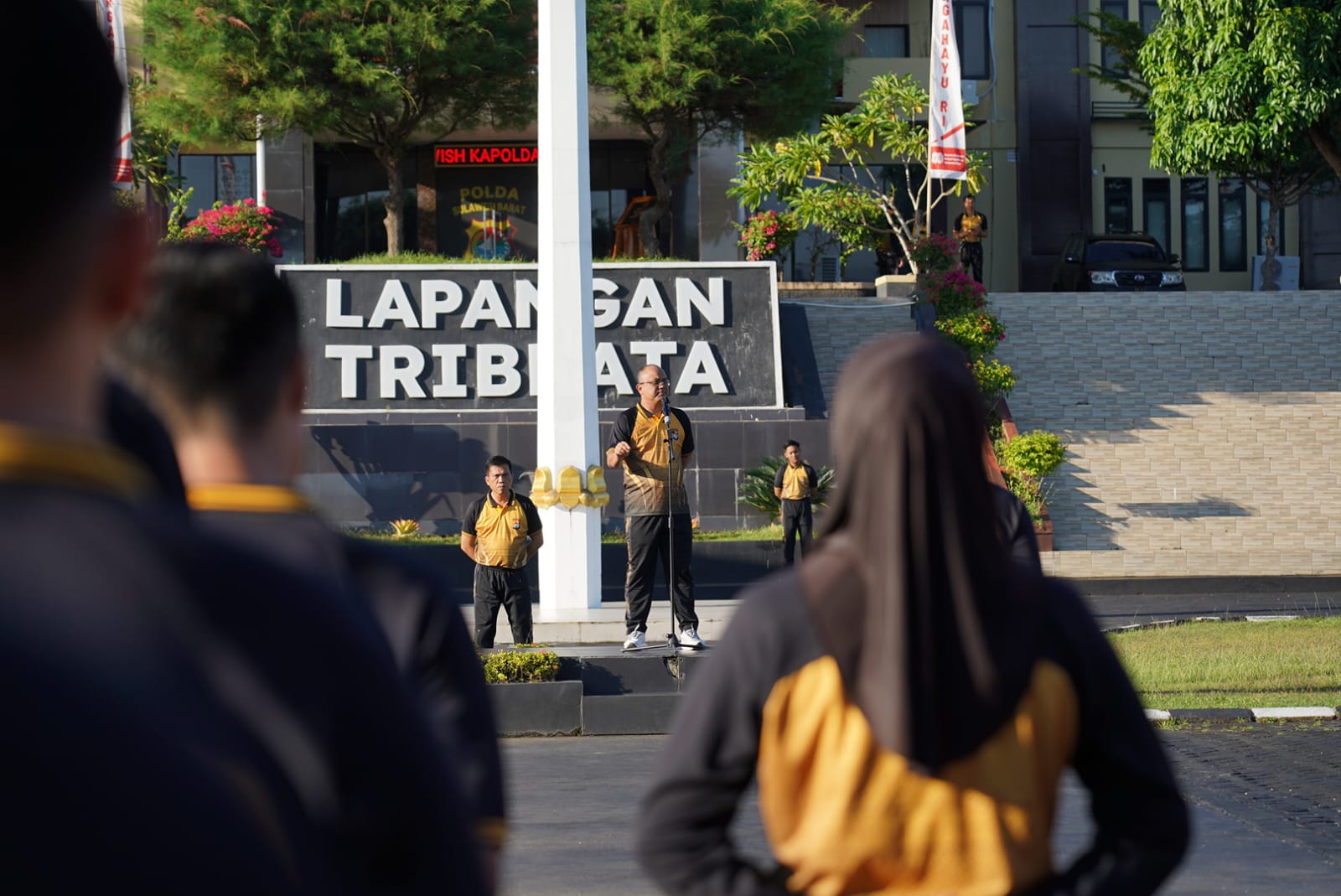 Polda Sulbar – Kapolda Sulbar, Irjen Pol Adi Deriyan Jayamarta, memberikan arahan penting kepada seluruh personelnya saat memimpin apel pagi, Jumat (29/8/25).