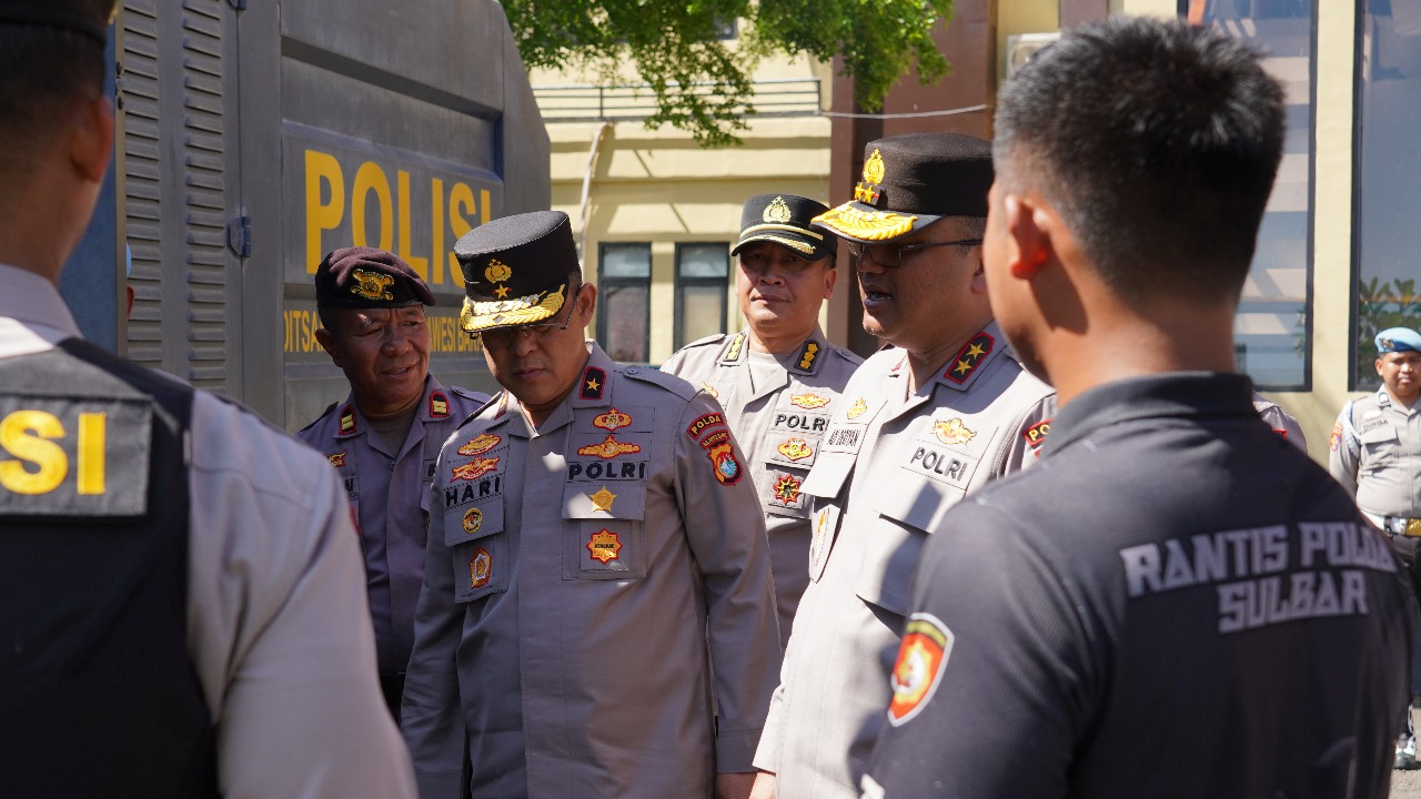 Polda Sulbar – Kapolda Sulawesi Barat, Irjen Pol Adi Deriyan Jayamatra, didampingi Wakapolda dan jajaran pejabat utamanya, melakukan pengecekan terhadap kendaraan taktis yang disiagakan untuk mengamankan aksi unjuk rasa. Pengecekan ini dilakukan sebagai langkah antisipasi terhadap potensi kerusuhan dan tindakan anarkis yang mungkin terjadi selama demonstrasi, Senin (1/9/25).