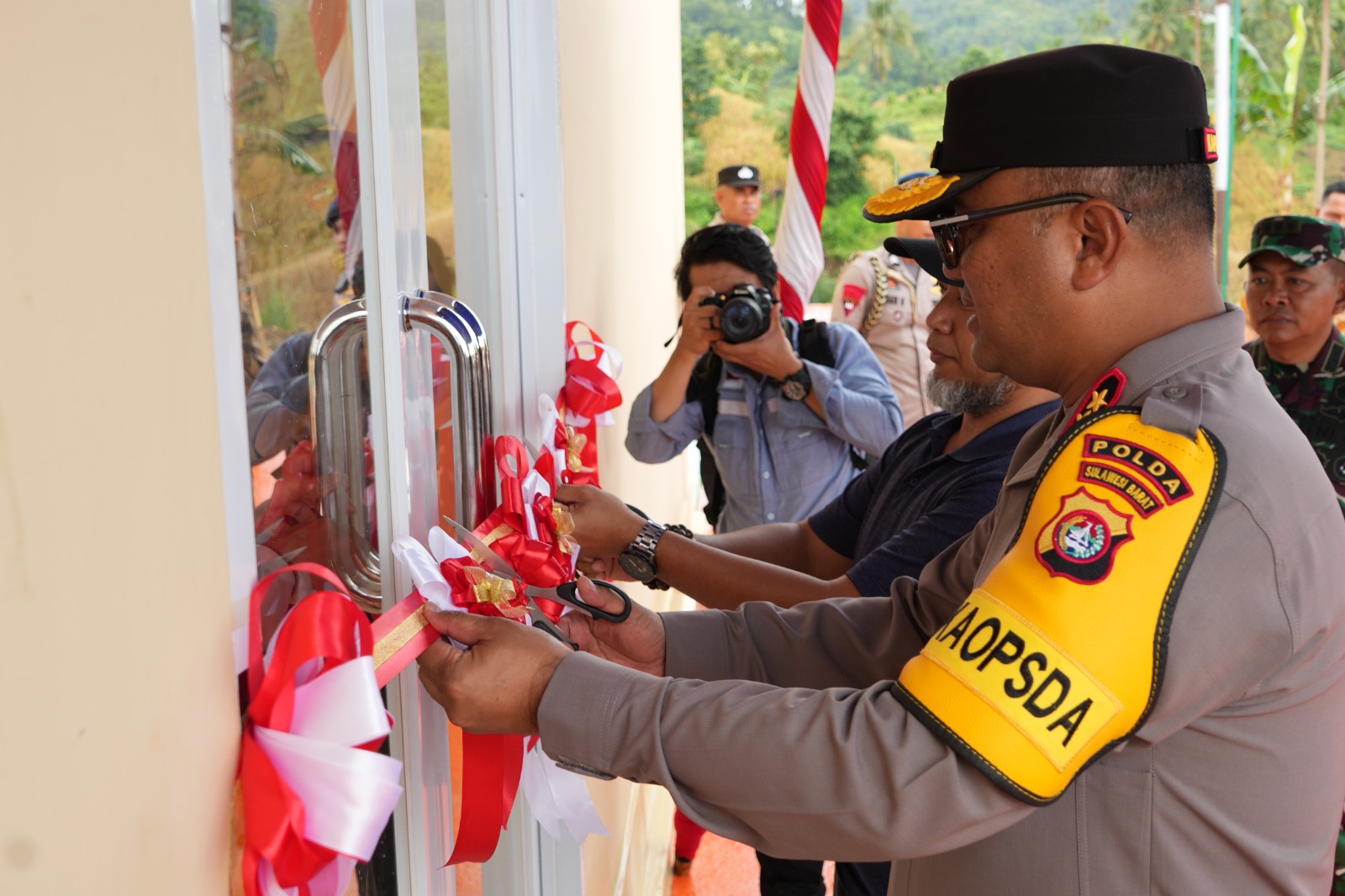 Terlihat secara simbolis Kapolda Sulbar beserta para tamu undangan lainnya memotong pita tanda resminya sport Center Polda Sulbar.