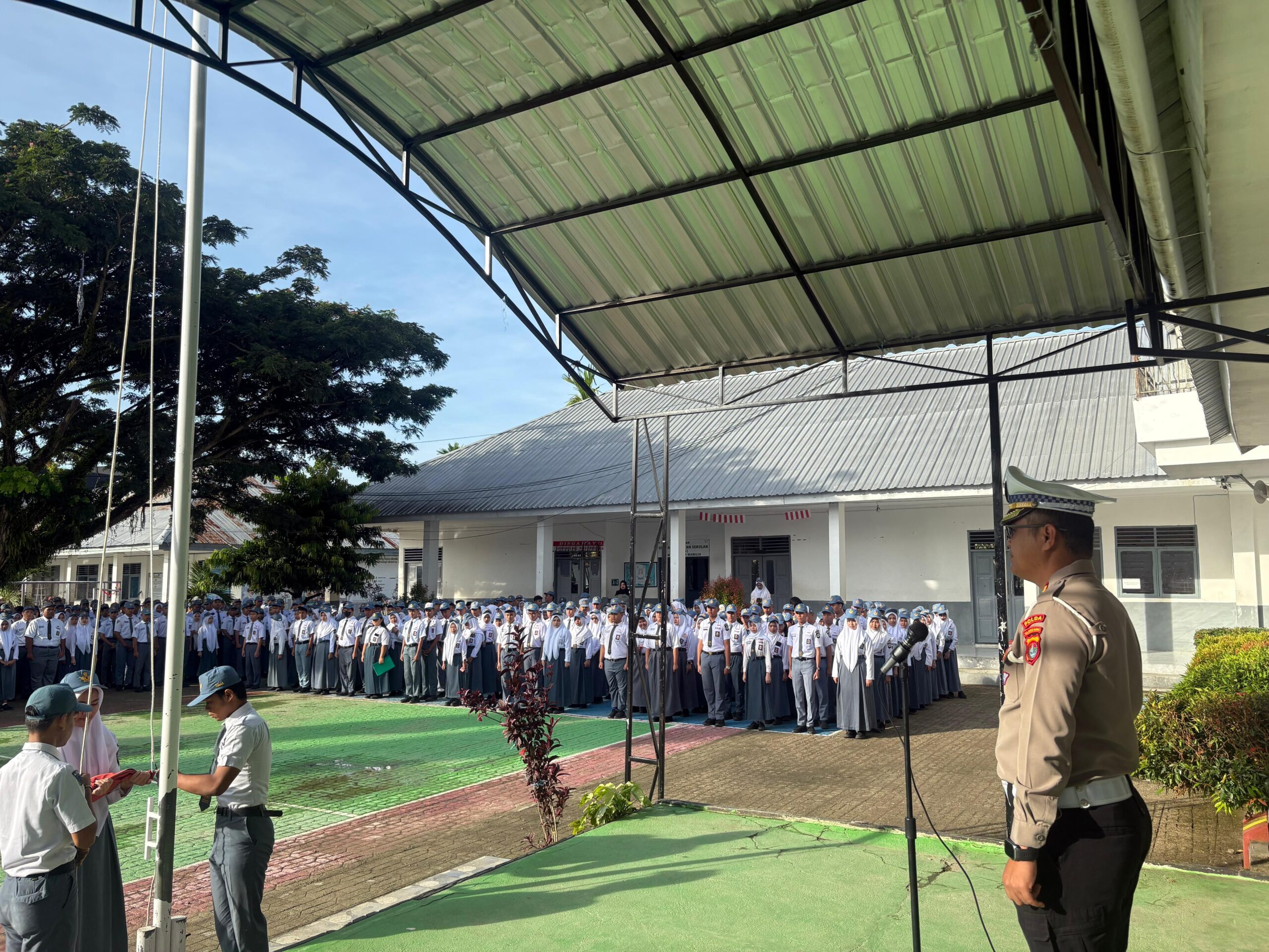 Polda Sulbar – Suasana berbeda terasa di SMA 1 Mamuju saat upacara bendera pada Senin (8/9/25). Kasubdit Regident Polda Sulbar, AKBP Ariantony Utama Bangalino, hadir sebagai pembina upacara dan memberikan sosialisasi tentang pentingnya keselamatan berlalu lintas.