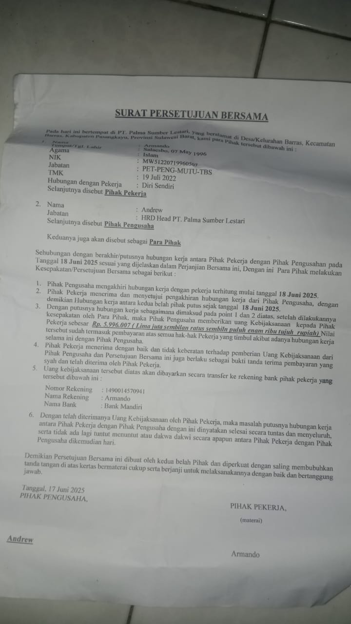 Sebelum Korban Armando di PHK, korban mengakui bahwa pihak perusahaan PT. Palma, memberikan surat resign (surat pengunduran diri) dan di duga pihak perusahaan memaksa Armando untuk menandatangani surat tersebut, tetapi Armando menolak karena dirinya tidak merasa bersalah karena Armando masih mau bekerja di perusahaan PT. Palma, namun berselang beberapa hari setelah itu, ironisnya, Armando di berikan surat persetujuan bersama yang tidak di tandatangani oleh pihak PT. Palma. surat tersebut terbit sejak tanggal, 17/6/2025.