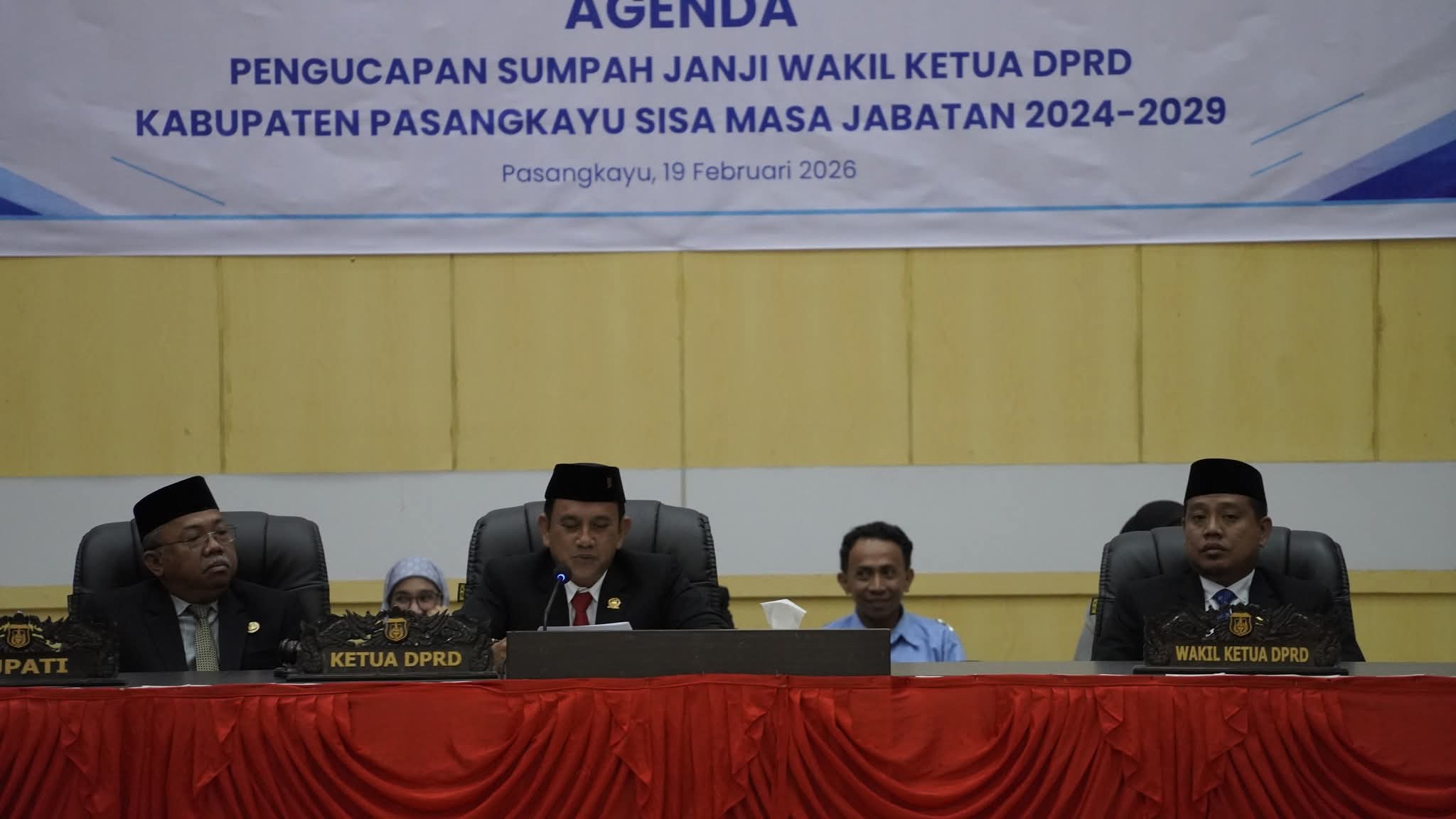 PASANGKAYU – Rapat paripurna DPRD Kabupaten Pasangkayu digelar di ruang rapat paripurna kantor DPRD Kab.Pasangkayu. kamis (19/2/2026) dengan agenda utama pengucapan sumpah janji wakil ketua DPRD Kabupaten Pasangkayu untuk sisa masa jabatan 2024-2029.Kegiatan tersebut dihadiri oleh berbagai pihak penting, antara lain Ketua Pengadilan Negeri Pasangkayu, pimpinan dan seluruh anggota DPRD Kabupaten Pasangkayu, forum koordinasi pimpinan daerah, para pejabat pemerintah daerah, Ketua Bawaslu Kabupaten Pasangkayu, Ketua KPU Kabupaten Pasangkayu, pimpinan instansi vertikal, para Camat, serta tokoh masyarakat Kabupaten Pasangkayu.Mewakili Bupati Pasangkayu, Sekretaris Daerah Kabupaten Pasangkayu, Muh. Zain Machmoed, S.Sos, menyampaikan ucapan selamat atas nama pemerintah daerah kepada Muh. Dasri, S.Pd., M.A.P., yang pada hari itu resmi mengucapkan sumpah janji sebagai wakil ketua DPRD Kabupaten Pasangkayu untuk sisa masa jabatan.“Atas nama Pemerintah Kabupaten Pasangkayu, saya, Sekretaris Daerah Kabupaten Pasangkayu Muh. Zain Machmoed, yang juga mewakili Bupati Pasangkayu, dengan segala hormat mengucapkan selamat kepada Bapak Muh. Dasri, S.Pd., M.A.P., yang pada hari ini, Kamis tanggal 19 Februari 2026, telah resmi mengucapkan sumpah janji sebagai Wakil Ketua Dewan Perwakilan Rakyat Daerah Kabupaten Pasangkayu untuk sisa masa jabatan periode 2024-2029.” Ucap Sekda.