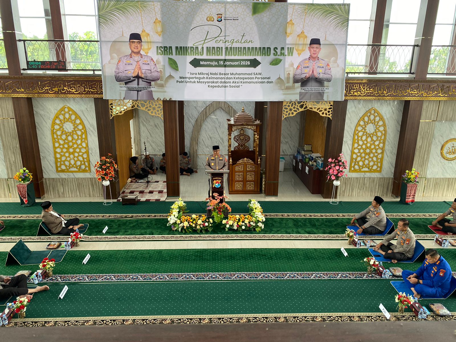 Polda Sulbar – Peringatan Isra Mikraj Nabi Muhammad Shallallahu Alaihi wa Sallam juga meriahkan lingkungan Polda Sulbar. Di Masjid Jabal Rahmah, Kamis (15/1/26), Kapolda Sulbar Irjen Pol Adi Deriyan Jayamarta bersama pejabat utama, serta seluruh personel muslim dan muslimah mengikuti rangkaian kegiatan ibadah dengan khidmat.