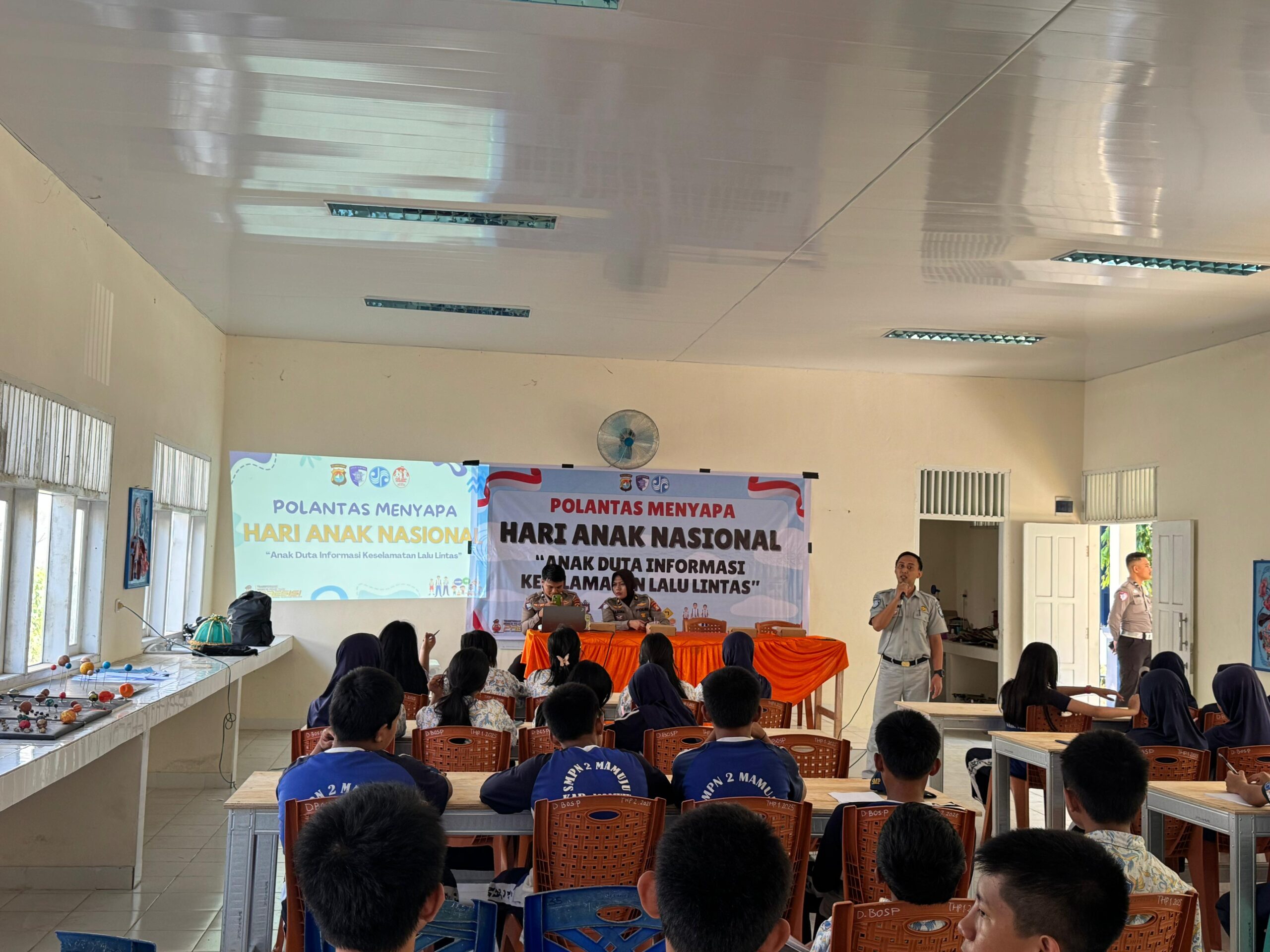 SULBAR, – Dalam rangka memperingati Hari Anak Nasional, Subdit Kamsel Ditlantas Polda Sulawesi Barat berkolaborasi dengan PT Jasa Raharja Cabang Mamuju menggelar kegiatan “Polantas Menyapa” di SMPN 2 Mamuju, Kamis (24/7/25).