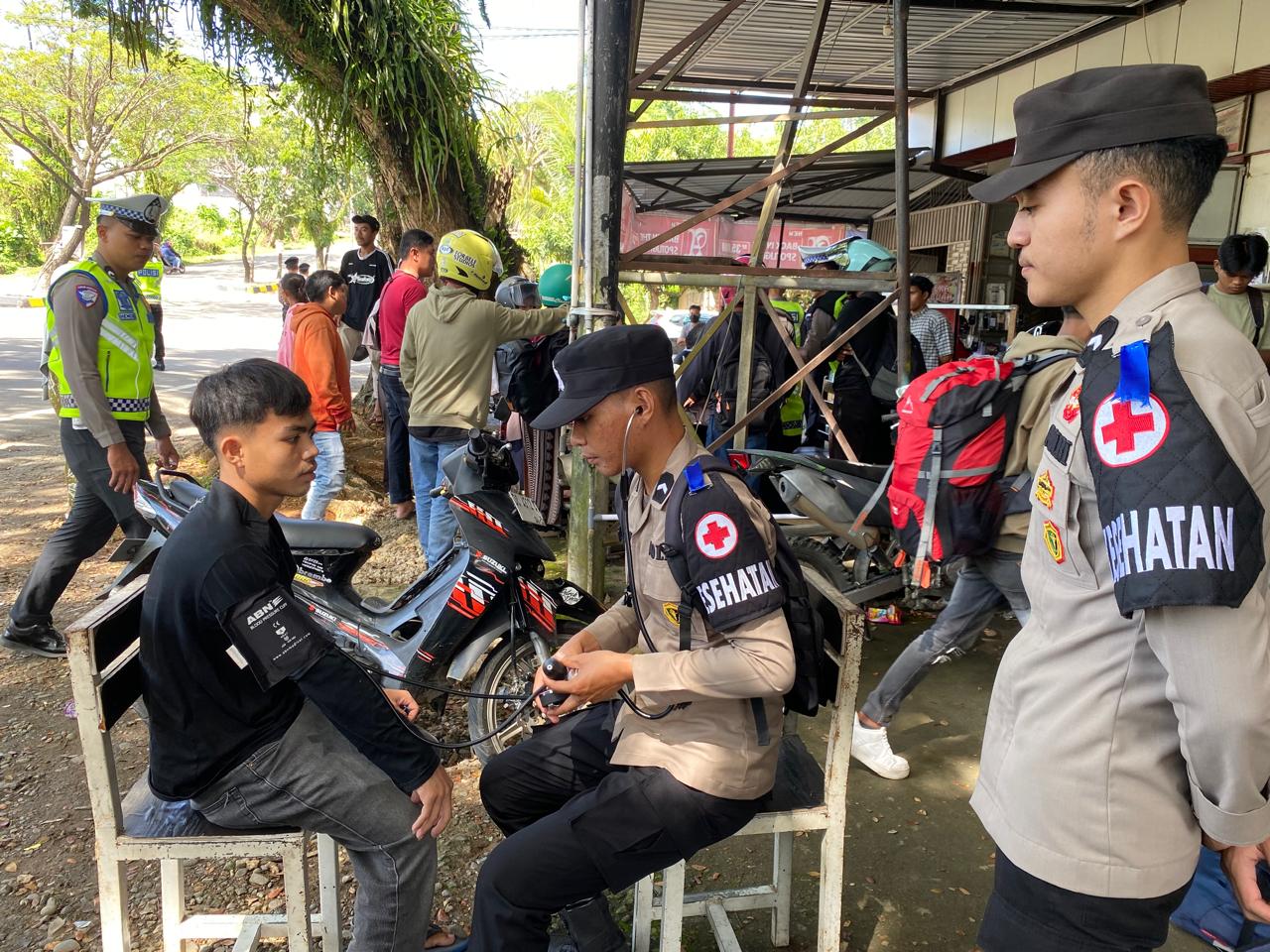 Tak hanya fokus melakukan pengaturan lalu lintas, edukasi serta pemeriksaan kelengkapan dokumen dan kondisi kendaraan pengendara, petugas juga memberikan layanan kesehatan dasar kepada pengendara yang terlihat kurang sehat atau mengalami keluhan ringan.