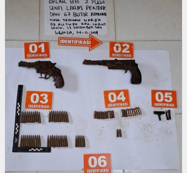 Kapolsek juga menyebut, Ada dua pucuk senpi laras pendek dan puluhan amunisi dalam kondisi berkarat yang ditemukan warganya dan oleh Kepala Desa selanjutnya dilaporkan kepada pihak Kepolisian