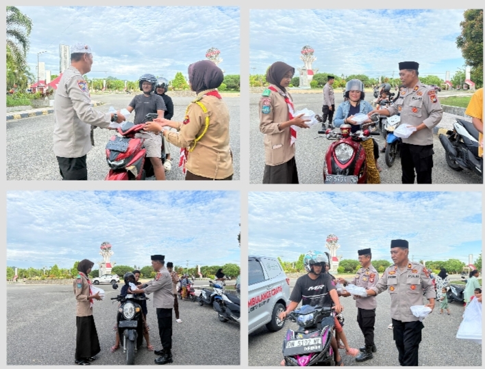 Polres Pasangkayu – Suasana sore di sekitar Bundaran Tugu Smart, Kelurahan Pasangkayu, Kabupaten Pasangkayu, Kamis (26/2/2026) pukul 16.30 Wita, terasa berbeda. Di tengah hiruk pikuk kendaraan yang melintas, jajaran Sat Binmas Polres Pasangkayu bersama anak-anak Saka Bhayangkara membagikan takjil kepada masyarakat pengguna jalan sebagai bentuk kepedulian dan kebersamaan di bulan suci Ramadan.