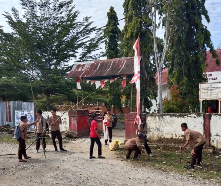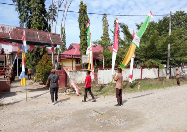 PASANGKAYU, – Jelang Hari Ulang Tahun (HUT) Republik Indonesia ke-80, Kepala Sekolah SMPN 01 Bulutaba Dra,Indo Iya, M.Pd mengerahkan guru dan murid untuk mendirikan umbul-umbul di depan pagar sekolah. Kegiatan ini merupakan salah satu bentuk persiapan untuk memperingati hari kemerdekaan Indonesia dengan meriah.