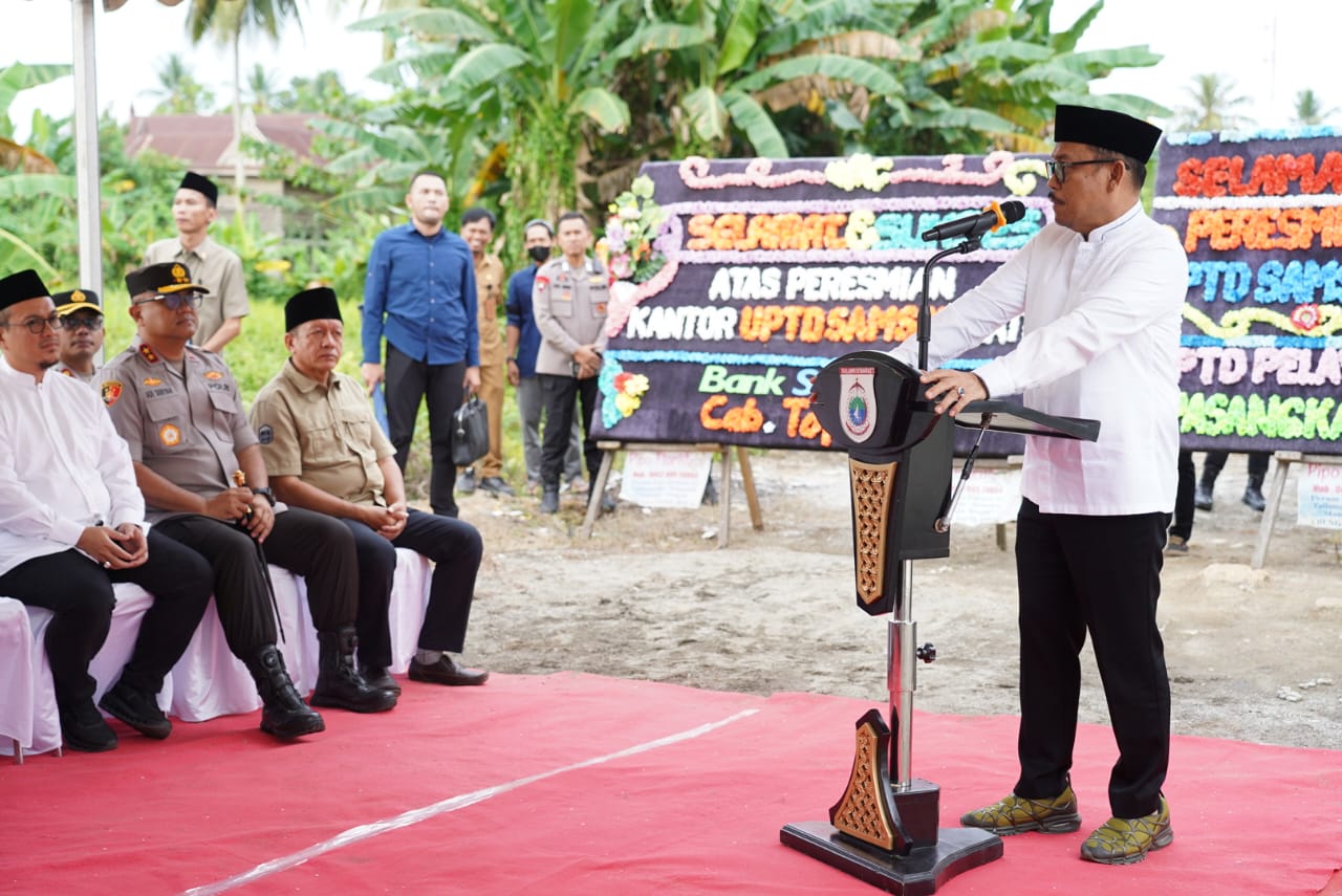 Ketua UPTD Kabupaten Mamuju Tengah menyampaikan laporan singkat terkait gedung baru UPTB Samsat yang telah beroperasi.