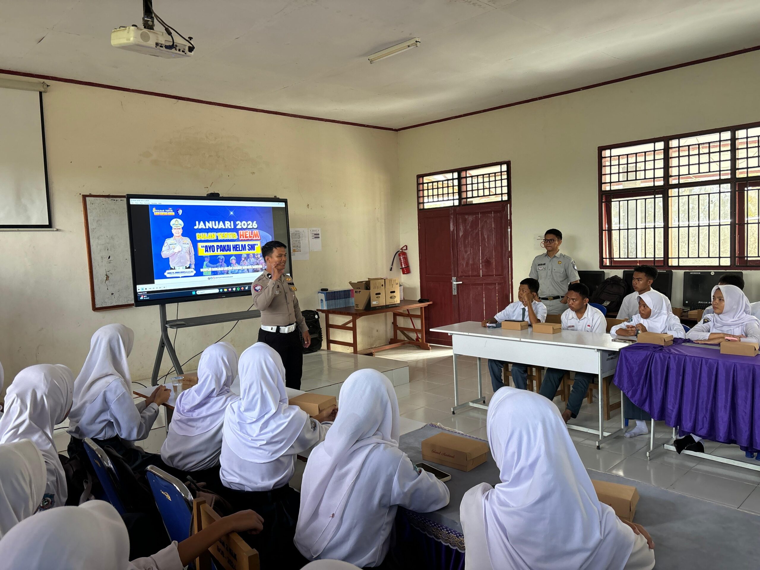 Polda Sulbar – Dalam rangka mengawal program tematik bulan Januari 2026 yaitu Bulan Tertib Helm (BTH), Direktorat Lalu Lintas (Ditlantas) Polda Sulawesi Barat bekerja sama dengan Jasa Raharja Cabang Mamuju menggelar sosialisasi keselamatan berlalu lintas dengan sasaran utama siswa dan guru di SMAN 2 Kalukku Mamuju, Selasa (20/1/26).