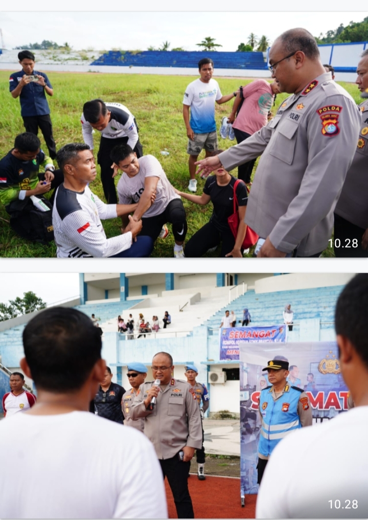 Polda Sulbar – Kapolda Sulawesi Barat, Irjen Pol Adi Deriyan Jayamarta, memberikan arahan dan motivasi kepada para peserta seleksi Sespimmen Polri T.A. 2026 yang tengah mengikuti uji kemampuan jasmani di Stadion Manakarra, Mamuju, Kamis (23/10/25).