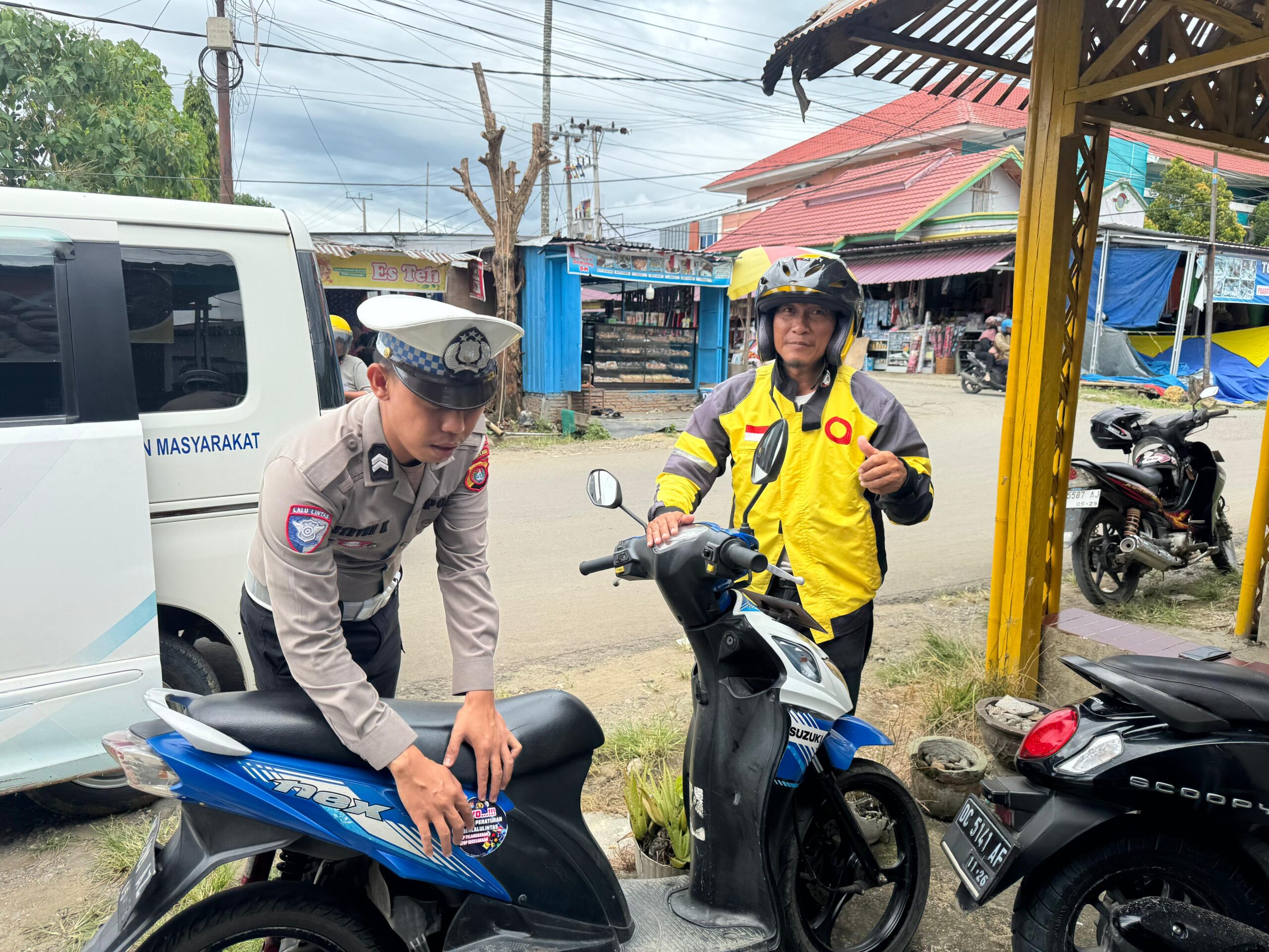 2. Pembagian Stiker Edukasi: Sebagai bentuk kampanye visual yang berkelanjutan, tim membagikan stiker Dikmas Lantas yang berisi pesan-pesan kunci tentang keselamatan berlalu lintas. Stiker ini diharapkan dapat menjadi pengingat visual bagi setiap pengendara untuk selalu mengutamakan keamanan saat berkendara.