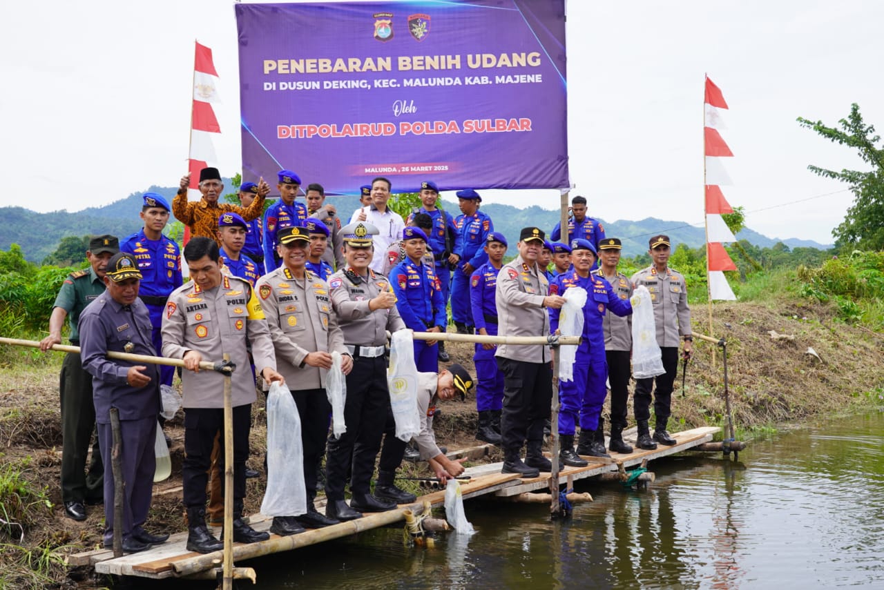 Harian Indonesia Pos.Com | Mamuju, Sulbar – Dalam upaya nyata mendukung program pemerintah dalam meningkatkan ketahanan pangan dan kesejahteraan masyarakat, Kapolda Sulawesi Barat (Sulbar), Irjen Pol. Adang Ginanjar, secara langsung turun ke lapangan. Bersama Ketua Bhayangkari Daerah Sulbar, Ny. Miranti Adang, dan rombongan pejabat utama (PJU) Polda Sulbar, beliau menebar ribuan benih udang di perairan Kecamatan Malunda, Rabu (26/3/25).