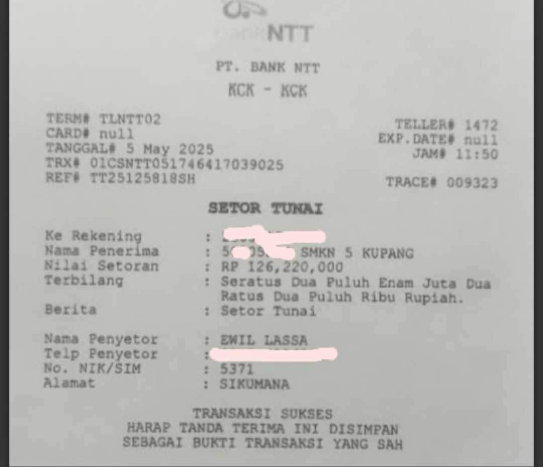 Dana tersebut dikembalikan penuh ke rekening BOS SMKN 5 Kupang melalui setoran tunai di Bank NTT. Setoran dilakukan oleh bendahara BOS atas nama Ewil Lassa, dengan bukti transaksi resmi bank berstatus sukses. Nominal dan rekening tujuan sesuai dengan data sekolah.