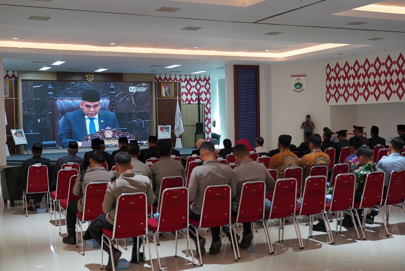 Wakapolda Sulbar bersama jajaran Forum Koordinasi Pimpinan Daerah (Forkopimda) Sulawesi Barat lainnya, mengikuti pidato Presiden RI di Aula Andi Depu, Kantor Gubernur Sulawesi Barat, Jumat (15/8/25).