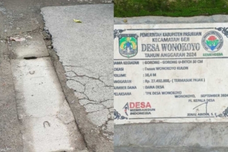 PASURUAN, harianindonesiapos.com | – Kabupaten Pasuruan Pembangunan gorong-gorong U-Ditch berukuran 30 cm di Dusun Wonokoyo Kulon, RT 01 RW 02, yang baru selesai dikerjakan pada bulan September 2024, kini menuai perhatian masyarakat. Proyek yang didanai Dana Desa (DD) tahun anggaran 2024 dengan anggaran sebesar Rp 27.492.000 ini mengalami kerusakan dalam waktu singkat, sehingga memunculkan pertanyaan terkait kualitas pengerjaan.